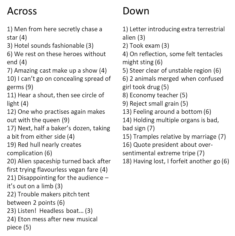 As well as writing the occasional blog post, I’m a cryptic crossword fan. I love to spend an evening curled up in front of a Times Quick Cryptic. I also love writing my own. I’ve written a few now, all of which you can download below. If you would like to give them a go, please let me know how you find them! I haven’t yet worked out how to make them interactive, but you should be able to print each one out (click on the download button at the bottom of this page) and give it a try. My latest crossword is shown below as well.